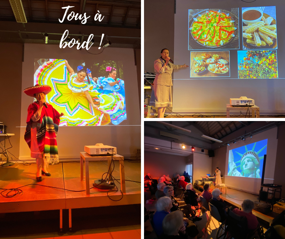 Soixante sept résidents ont été invités à monter à bord de l’Airbus A380 en compagnie de Juliette l’hôtesse de l’air ! Des histoires, de la vidéo projection, des chansons, des danses, des jeux et une grande interactivité ont composé ce spectacle avec les résidents. Ils ont ainsi pu découvrir les orangeraies en Espagne, observer les animaux d’Afrique au Kenya, voler sur les ailes du grand condor au Pérou, danser la Bamba au Mexique, survoler le grand canyon ou encore flâner le long des Champs Elysées à Paris.