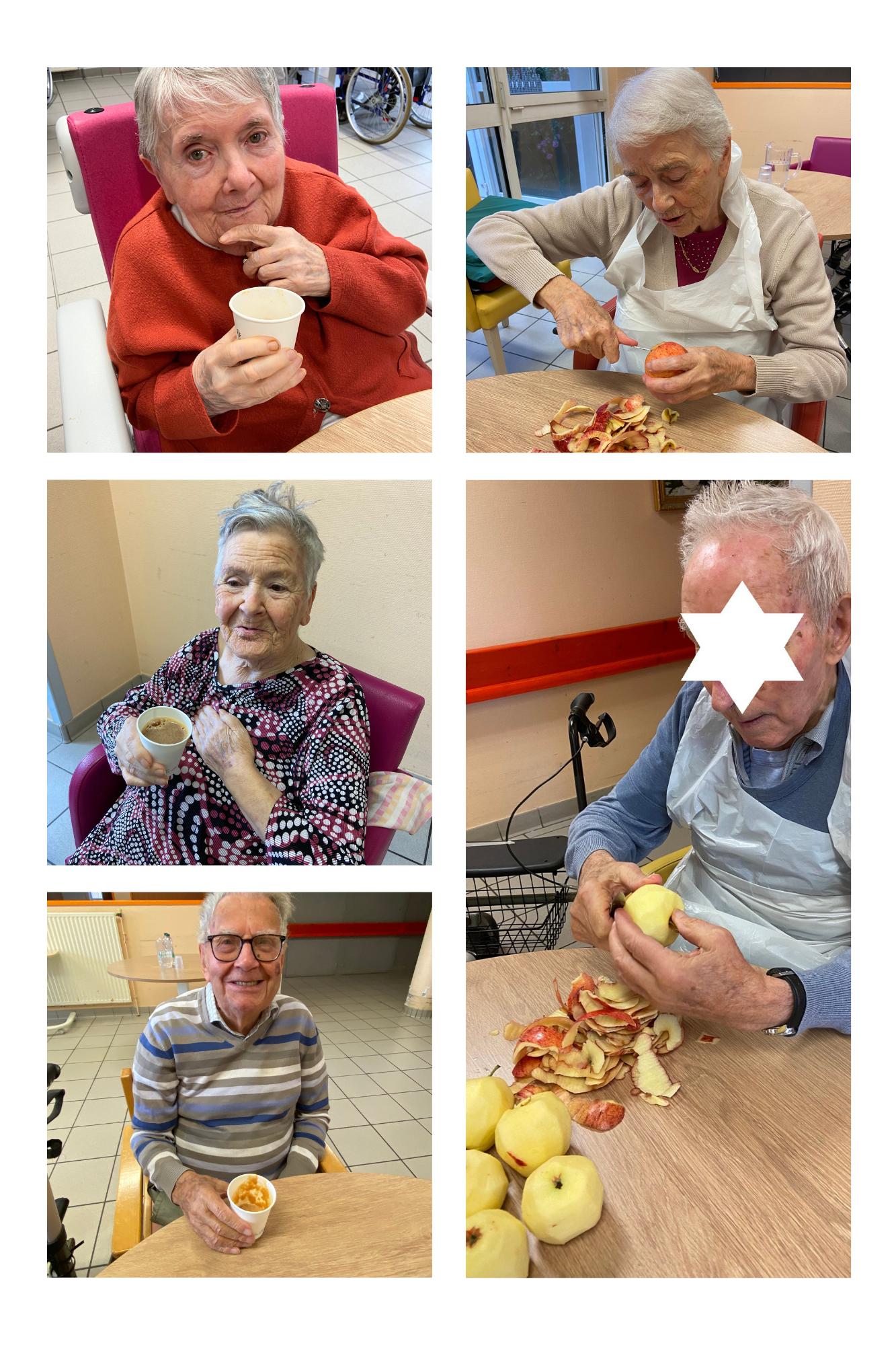 Ainsi, ce sont une quarantaine de résidents qui en ont bénéficié en ce mois de Septembre ! Certains acteurs en épluchant les pommes et d’autres en le dégustant ! L’occasion en même temps de leur organiser un petit apéritif avec le service de chips et pâté en croûte, une attention appréciée des résidents qui ont su le verbaliser.