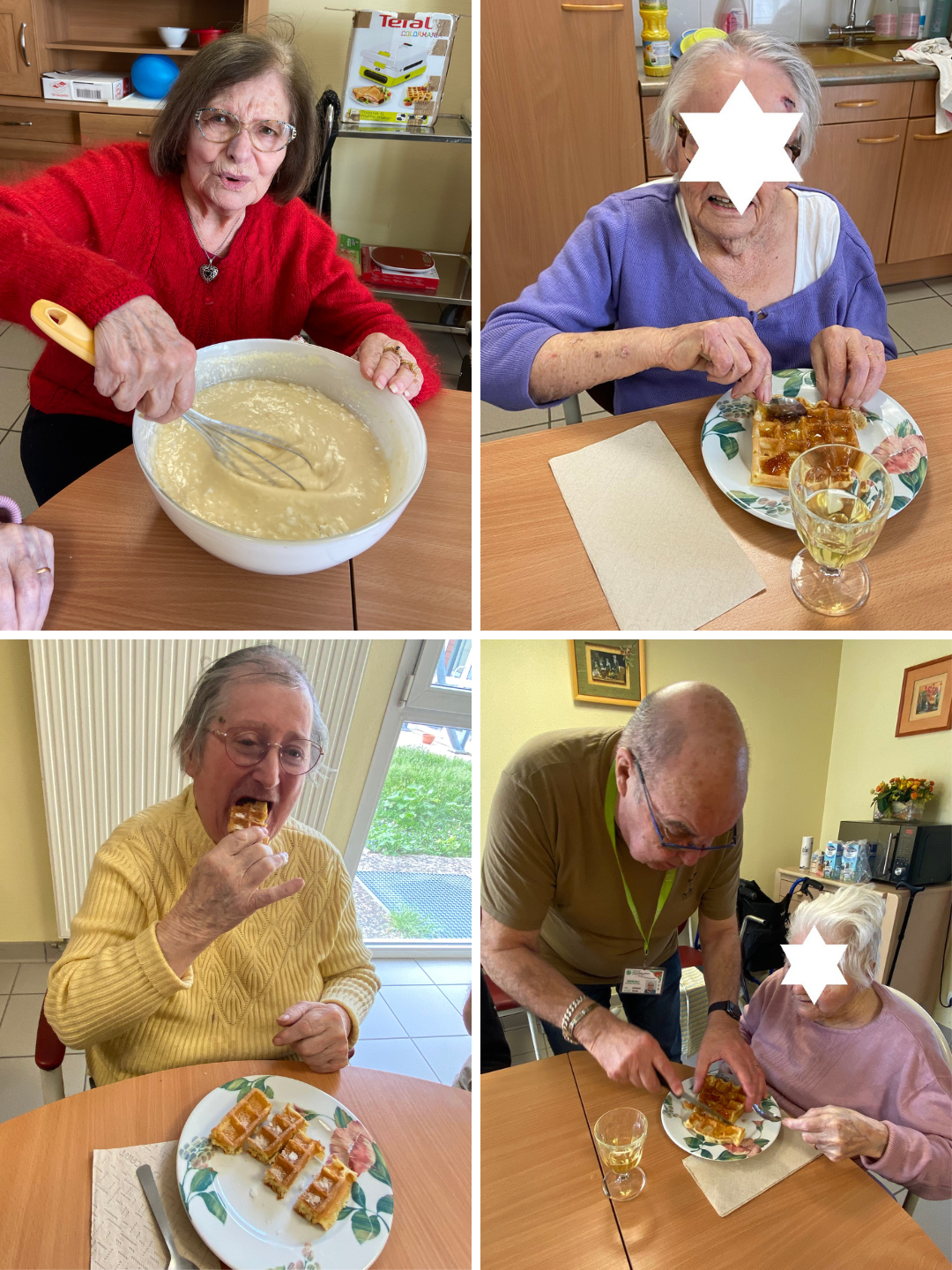 3e étape : Après la préparation, place à la cuisson ! Et c'est à ce moment, que l'odeur alléchante des gaufres s'est propagée dans toute la résidence, stimulant les sens des résidents, du personnel et des visiteurs ! Les plus curieux et gourmands se sont laissés guider par leur odorat jusqu'à l'Auberge des Gourmandises pour vérifier s'il des restes de gaufres étaient disponibles. Le moment tant attendu était évidemment la dégustation.