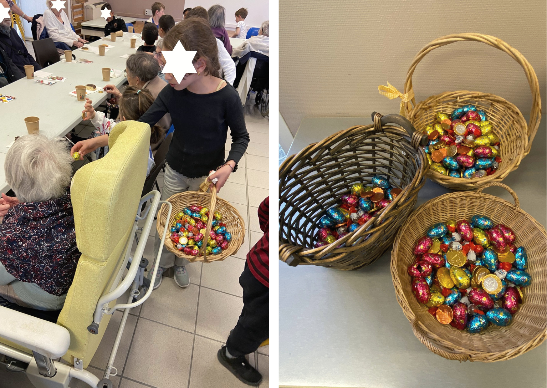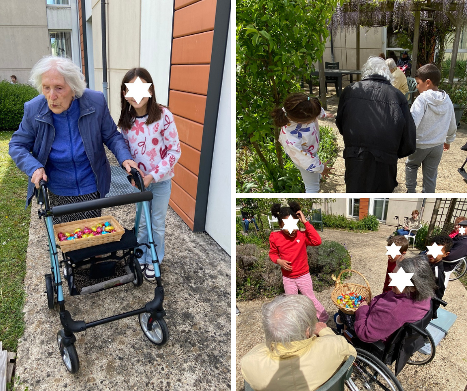 Les enfants ont été répartis en deux groupes, chacun investit dans un patio, où ils ont rejoint les résidents volontaires pour partir ensemble à la recherche des œufs dissimulés en amont. L'arrivée des enfants au sein de leur lieu de vie a immédiatement illuminé les visages des résidents, ravis de partager ce moment avec la jeune génération.