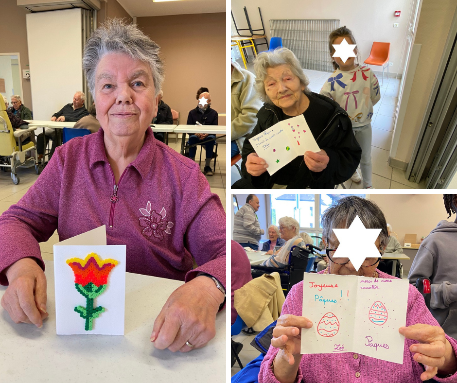 Une belle surprise attendait également les résidents : les enfants ont offerts, avec beaucoup de fierté, des petites cartes fabriquées en amont à l’Accueil de Loisirs sur le thème de Pâques. Ce geste attentionné a profondément touché de nombreux résidents, suscitant même quelques larmes de joie pour certains.