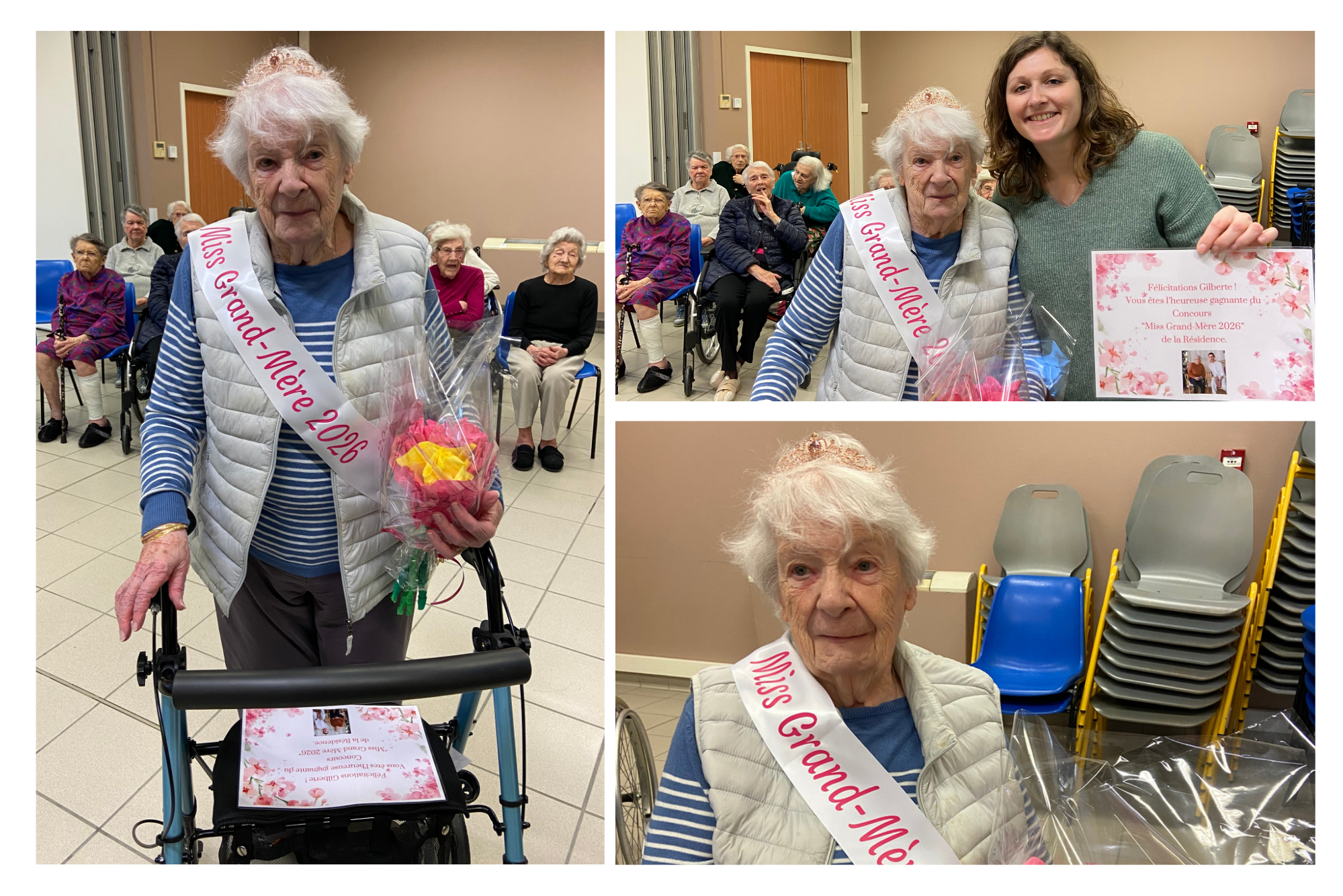 Une cérémonie pour annoncer les résultats et remettre les récompenses à la gagnante s’est déroulée ce mercredi. Ainsi, Gilberte a reçu un joli bouquet de fleurs en papier accompagnée d’une carte de félicitations. Elle a été couronnée d’un diadème étincelant ainsi qu’une écharpe de Miss Grand-Mère 2026. Un moment riche en émotions et très valorisant pour elle.