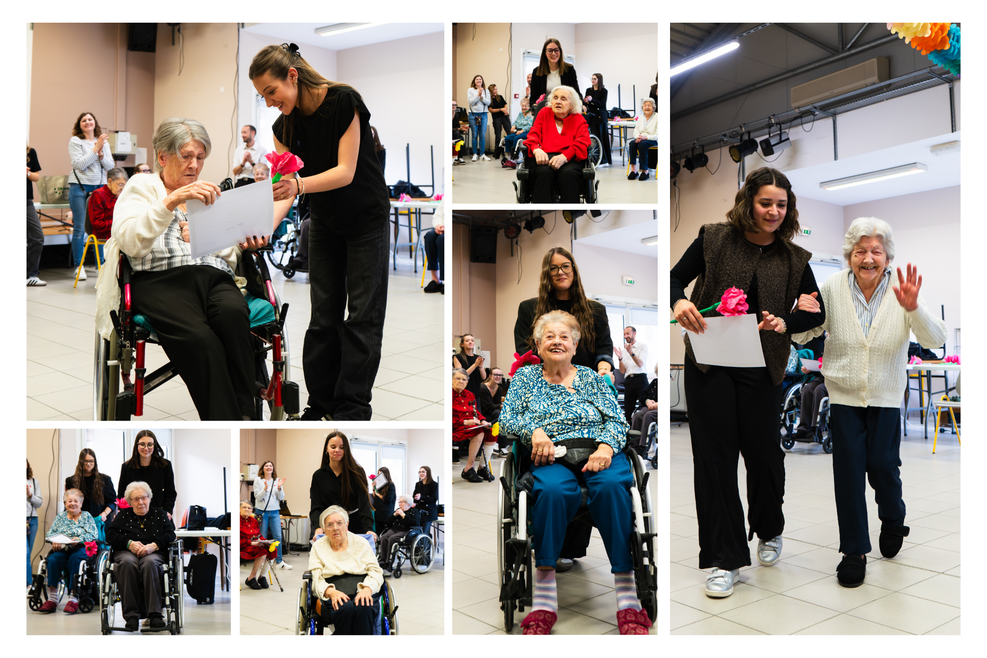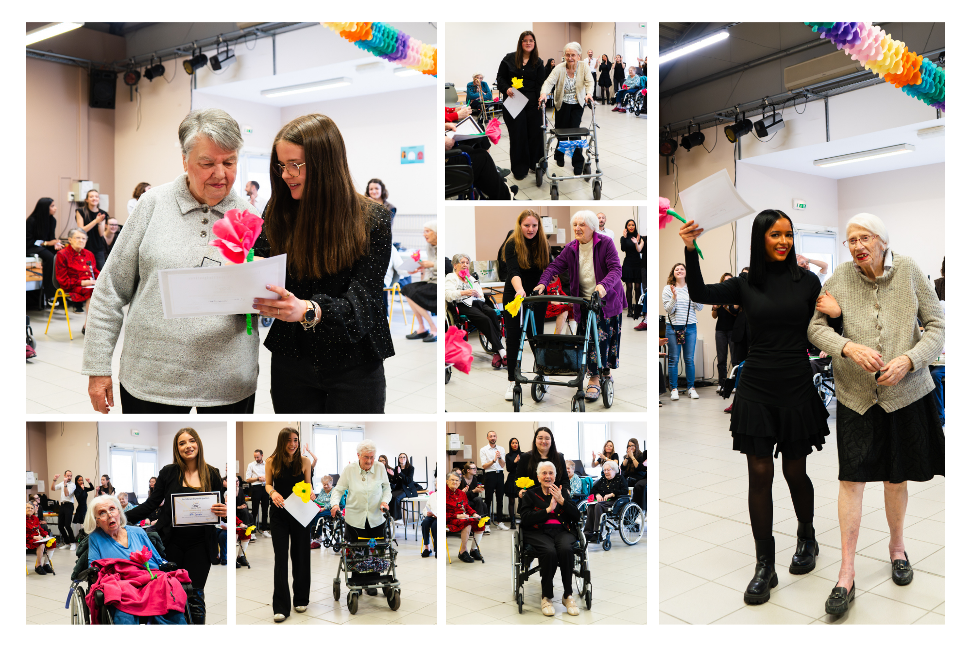 L’après-midi s’est poursuit avec un défilé fictif de l’ensemble des participantes accompagnées par leur apprenti qui leur ont remis à chacune, un certificat de participation au Concours ainsi qu’une fleur en papier confectionnée en amont en atelier créatif par des résidents et Elisa AMP.