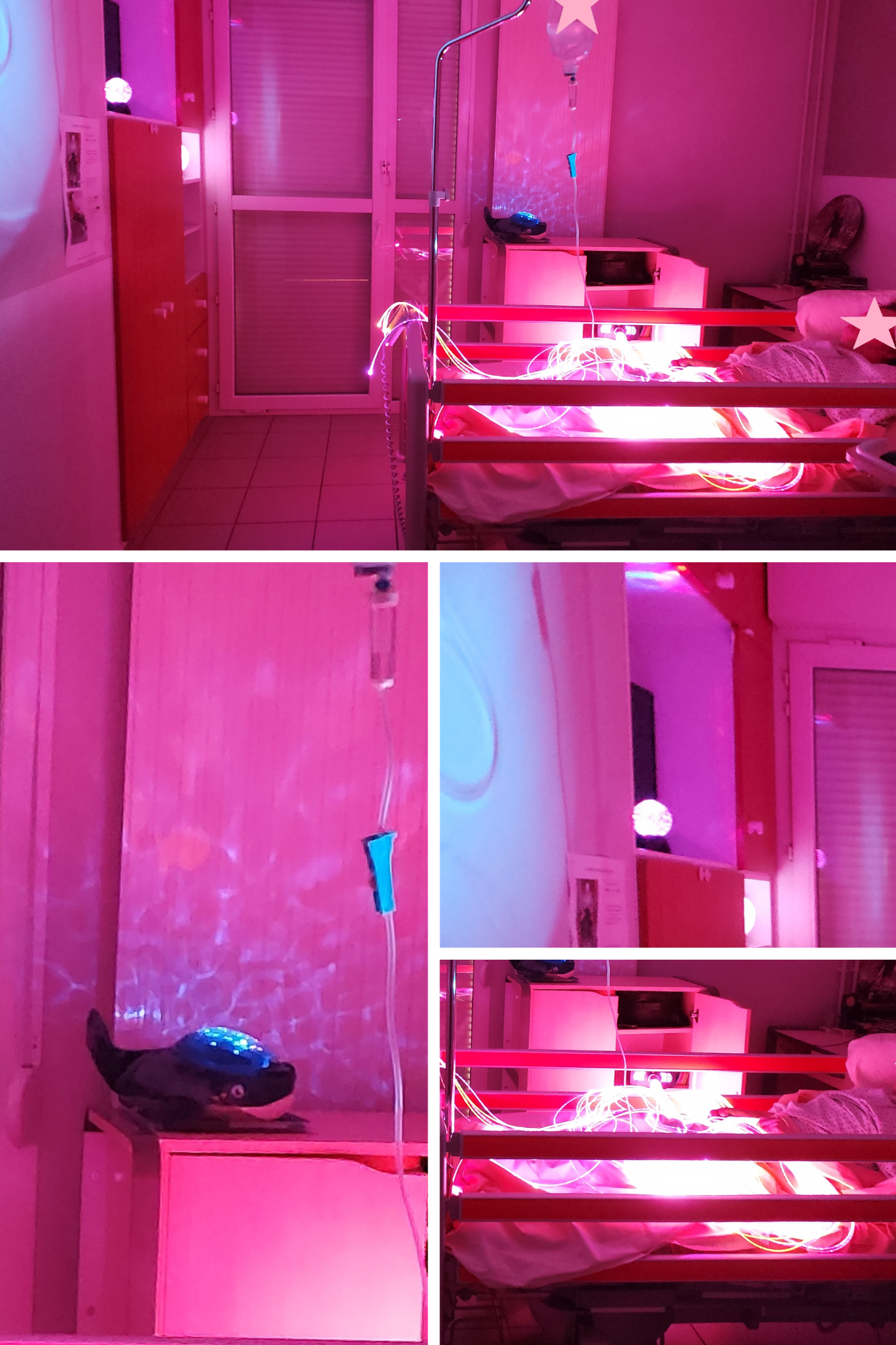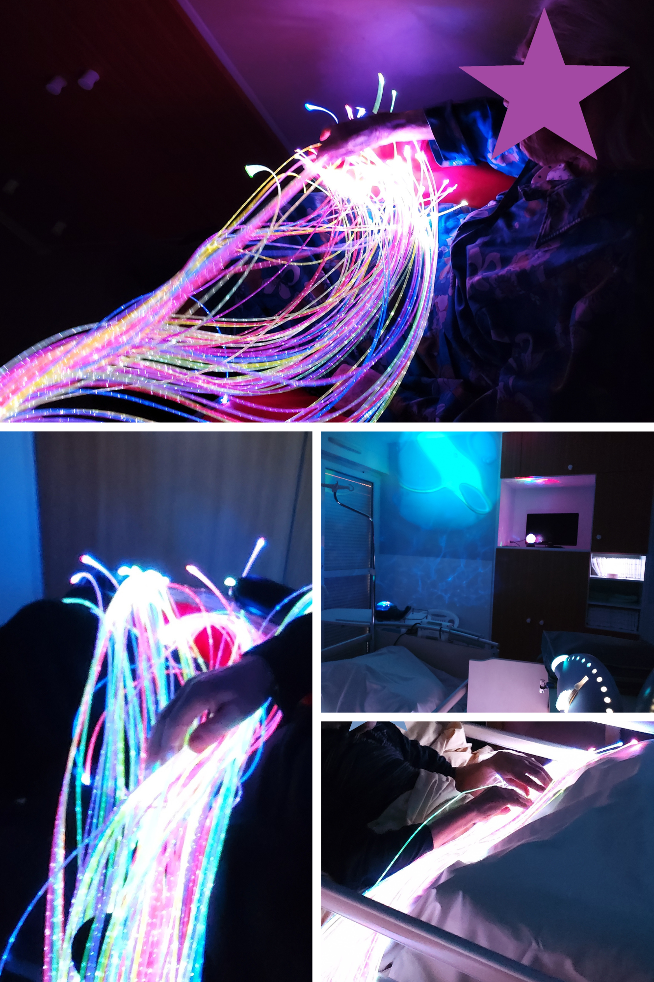 Les stores sont abaissés pour diminuer la luminosité extérieure, que l’accompagnant remplace par un projecteur de lumière douce et colorée